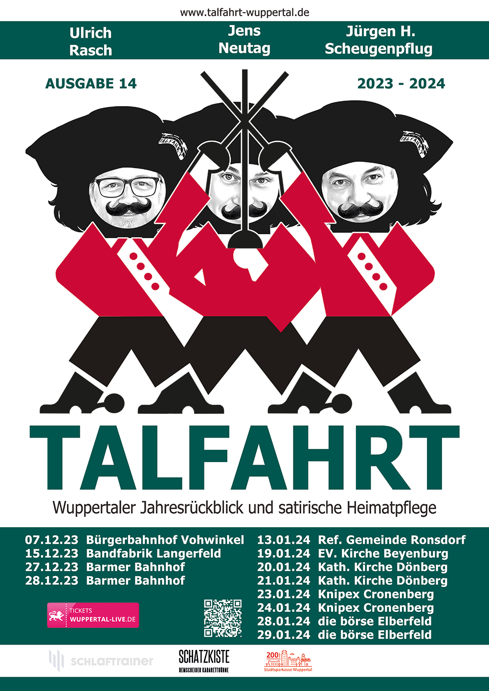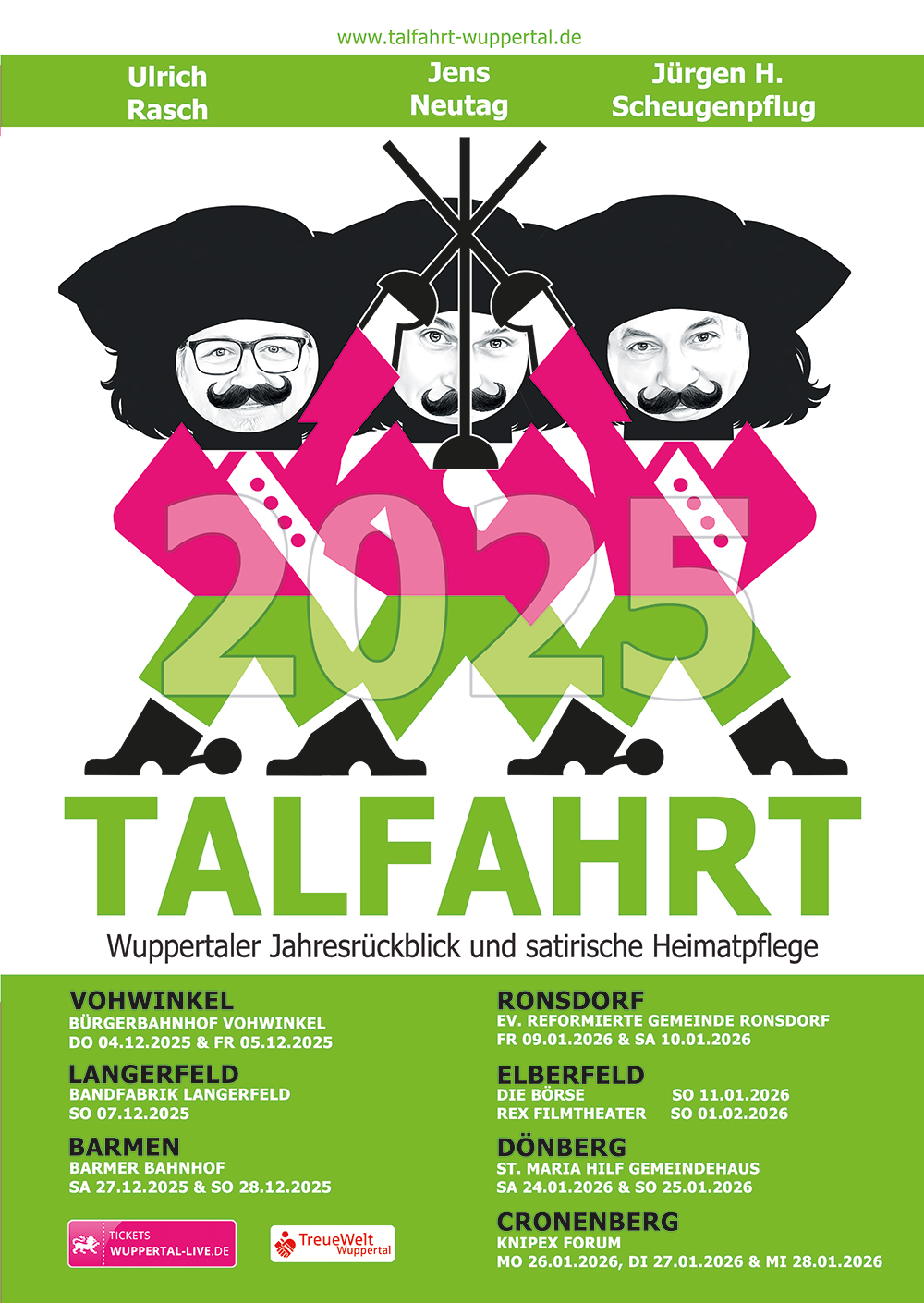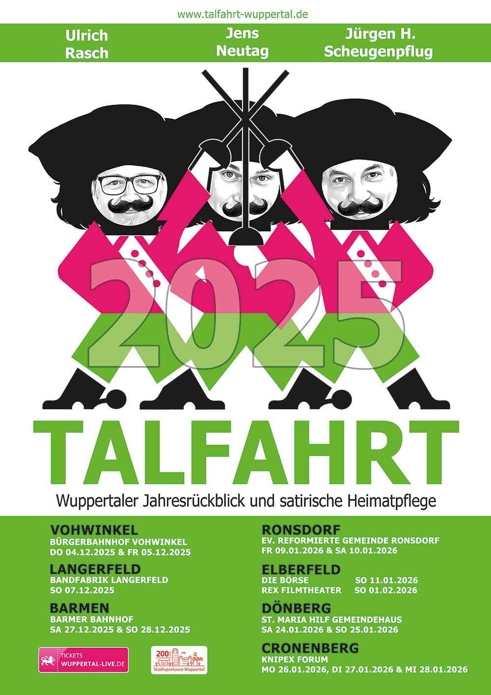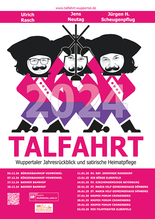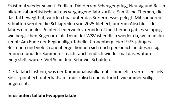 Es ist mal wieder soweit. Endlich! Die Herren Scheugenpflug, Neutag und Rasch blicken kabarettistisch auf das vergangene Jahr zurück. Sämtliche Themen, die das Tal bewegt hat, werden final unter das Seziermesser gelegt. Mit sauberen Schnitten werden die Schlagzeilen von 2025 filetiert, um zum Abschluss des Jahres ein finales Pointen-Feuerwerk zu zünden. Und Themen gab es so üppig wie bergischen Regen im Juli. Denn der WSV ist endlich wieder da, wo man ihn kennt: Am Ende der Regionalliga-Tabelle, Cronenberg feiert 975-jähriges Bestehen und viele Cronenberger können sich noch persönlich an diesen Tag erinnern und der Kämmerer macht auch endlich wieder mal das, wofür er eingestellt wurde: Viel Schulden. Sehr viel Schulden.